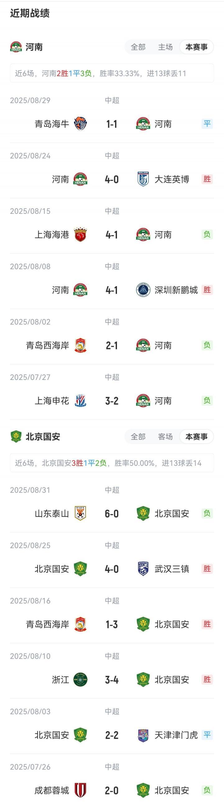 双方近期中超战绩↓
