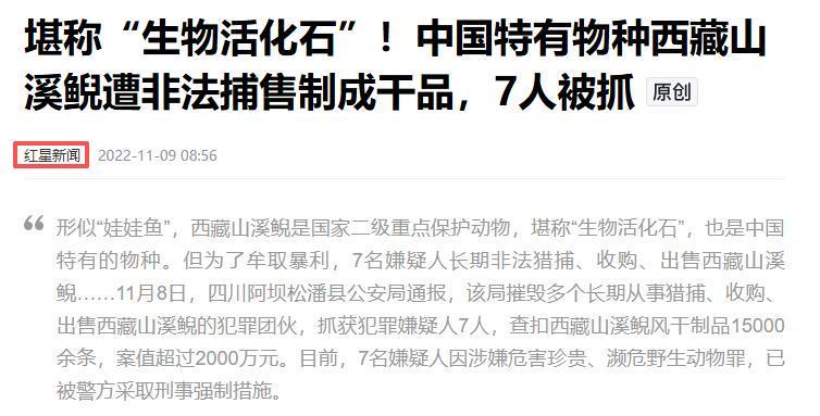 红星新闻《堪称“生物活化石”!中国特有物种西藏山溪鲵遭非法捕售制成干品,7人被抓》2022-11-09